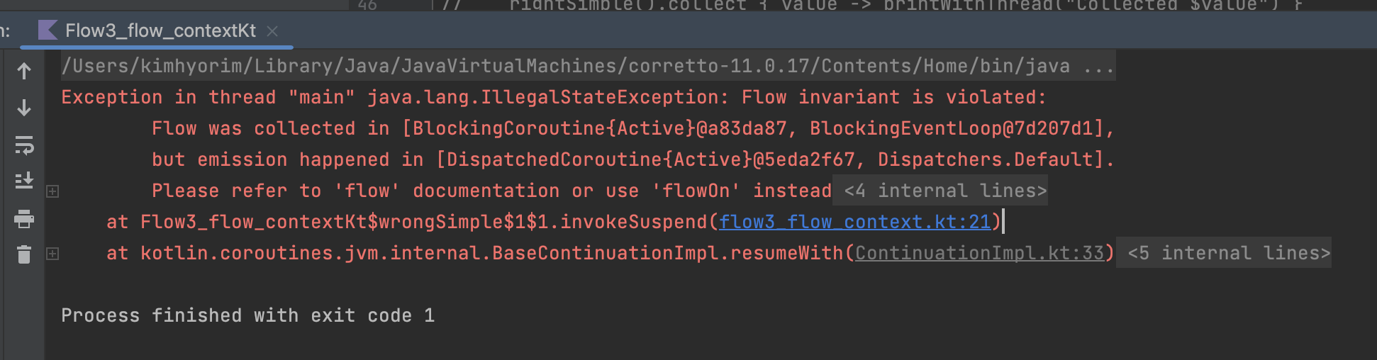 그래서 결론은 flowOn을 활용해서 하나의 스레드에서 데이터를 일관되게 방출해야 한다는 것!