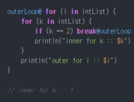NOTE 1. 이중 반복문을 사용하며, inner loop 에서 바로 outer loop의 break 혹은 coninue를 호출하고 싶을 경우 아래와 같이 사용가능하다. (번외) 내가 애정하는 kotlin에서는 outerLoop@ 로 해당 기능을 지원한다
